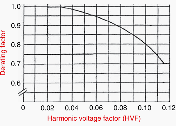 Gambar 1 dari NEMA (Asosiasi Produsen Amerika Utara) menunjukkan faktor penurunan peringkat berkenaan dengan faktor tegangan harmonik, yang merupakan nama lain untuk faktor distorsi tegangan.