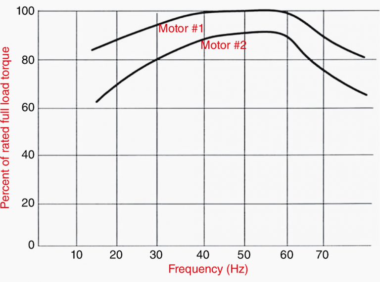 Gambar 2 direproduksi dari NEMA. Untuk operasi di atas 90 Hz pada tingkat daya kuda yang dibutuhkan, mungkin perlu menggunakan motor dengan rating 60 Hz yang lebih tinggi. Motor dengan faktor layanan 1,15 merupakan pilihan yang lebih baik.